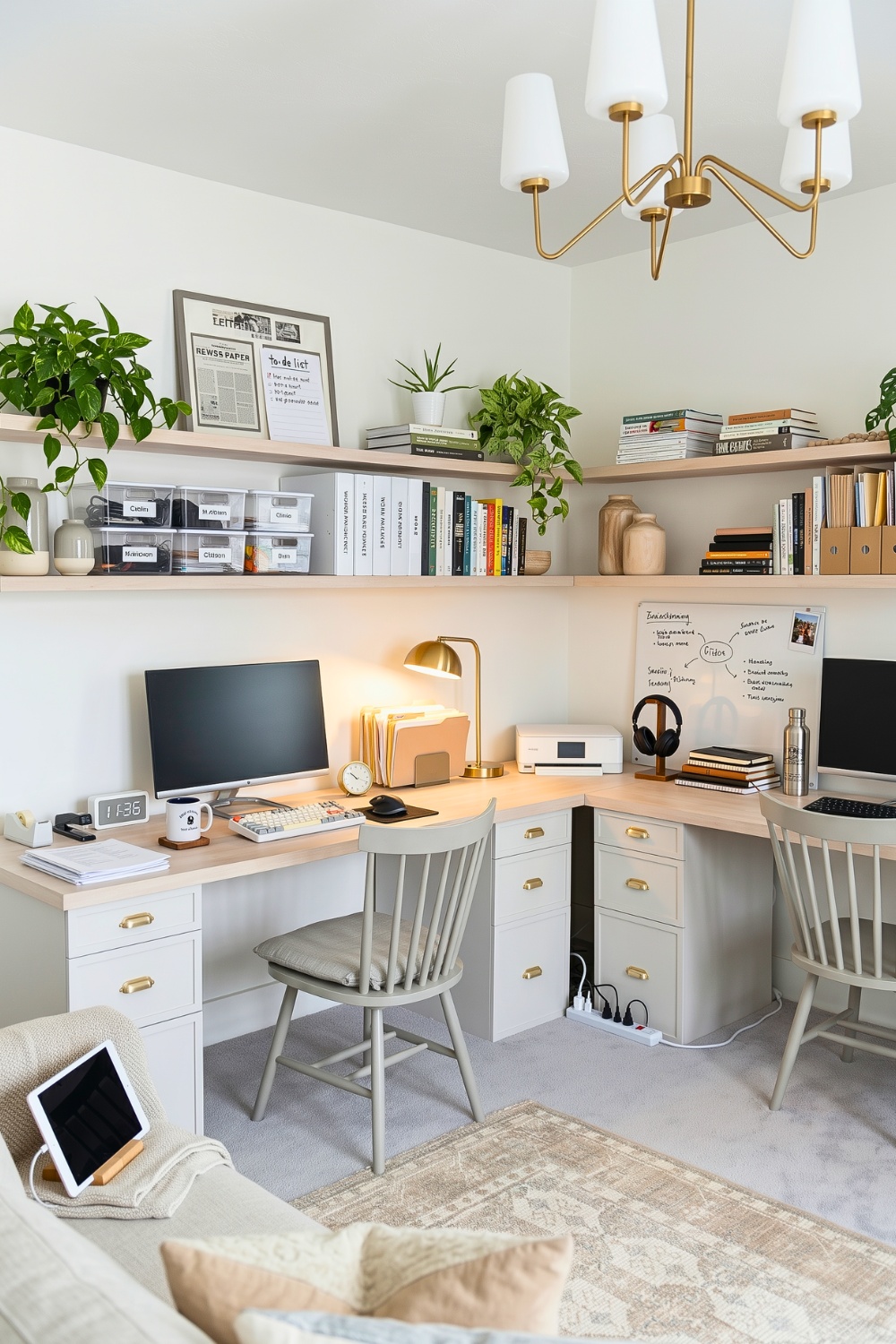 Using an L-shaped or U-shaped desk in the corner of a room is a clever way to make the most of limited space. Each person can sit at either end, and the corner provides a central area for shared items like printers or organizers. It’s an excellent way to use an underutilized corner in a small room.