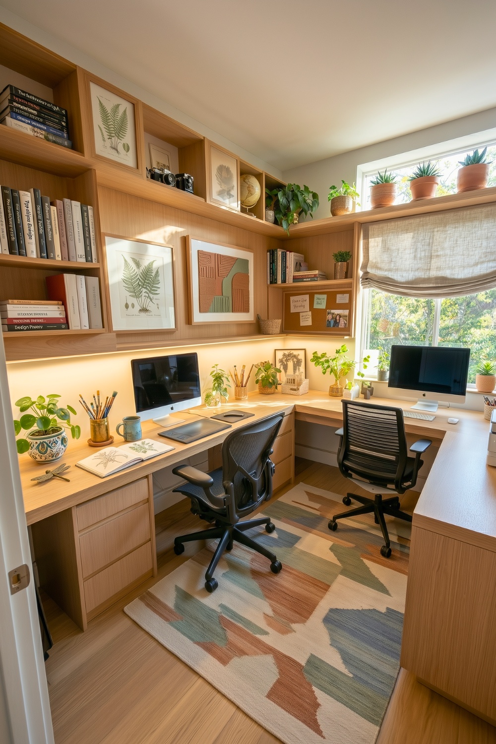 I’ve always been a fan of how warm wood tones can make a shared office feel less like a cubicle and more like a sanctuary. This l-shaped layout uses under-shelf lighting to solve the problem of dark corners, while the built-in shelves keep our creative tools right where we need them. It’s a great example of how an earthy palette can make a small space feel incredibly cozy and grounded.