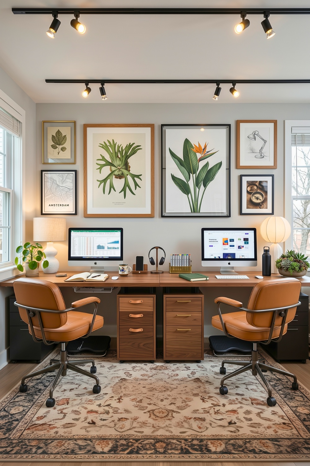 If you’re like me and love a clean, balanced look, a symmetrical long desk with a central storage hub is the way to go. I love how this gallery wall adds a modern, artistic touch that ties the whole room together, proving that a his and her office can be both functional and incredibly chic. The addition of a patterned rug helps define the work station area while adding a layer of sophisticated style.