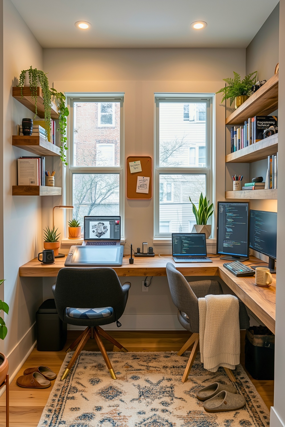 When space is at a premium, I find that tucking two workstations into a narrow alcove under twin windows is a total game-changer for focus. These rustic floating shelves provide essential storage without making the walls feel crowded, creating an efficient dual setup for a tiny apartment. My favorite part is how the natural light keeps the mood high even when the workload is heavy.