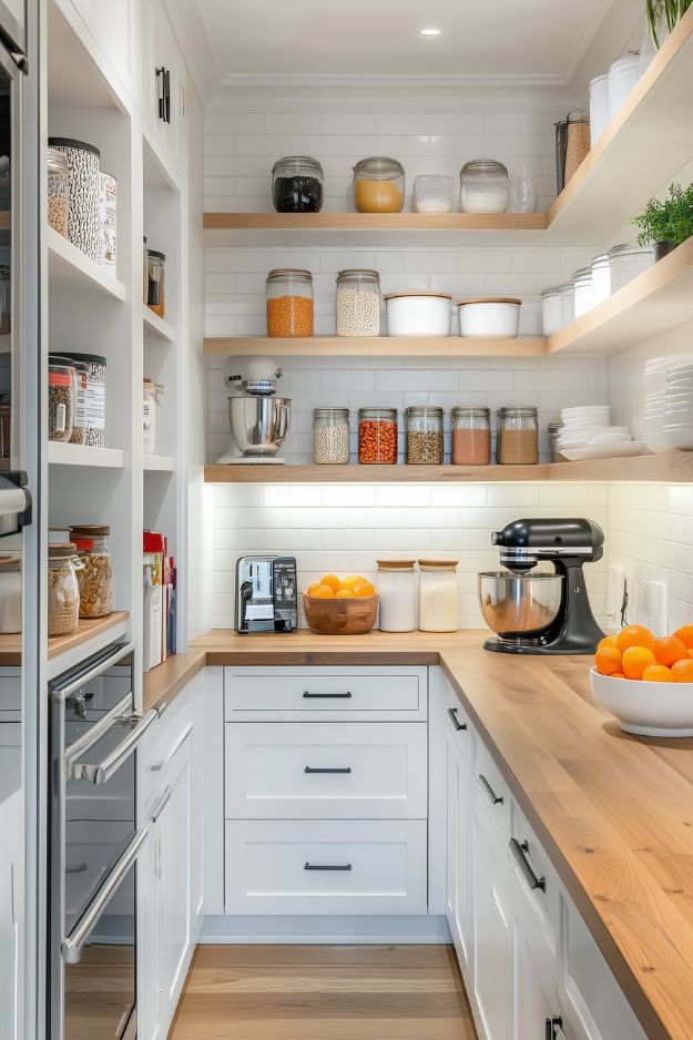 I can’t get over how “clean but warm” this pantry corner feels. The chunky wood countertops and floating shelves give it that custom-built look, but the styling stays simple enough to actually live with. The white subway tile makes everything look brighter and fresher, and the baskets of fruit add that lived-in, grab-and-go vibe. If you want to recreate this, start with one strong wood tone and keep your containers consistent.