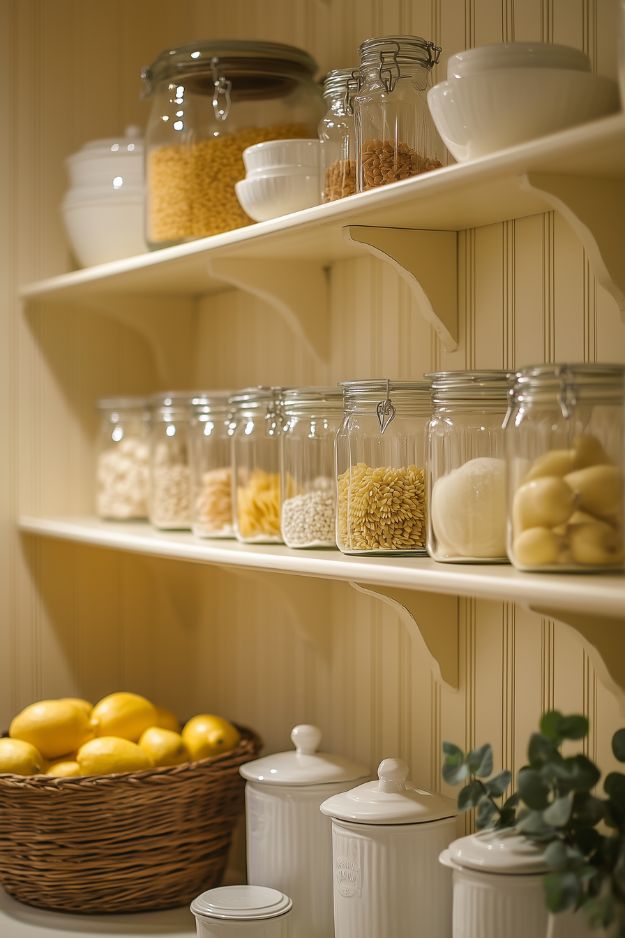 Something about this pantry feels quietly luxurious in a cottage-core, I-bake-on-weekends kind of way. The soft wallpaper, classic brackets, and rows of matching glass jars give it that old-school pantry charm, but it still feels clean and intentional, not fussy. I love how everything is visible without looking cluttered, which makes grabbing ingredients feel effortless and low-stress. The lemons in a woven basket and simple white canisters at the bottom add just enough warmth to keep it from feeling too precious.