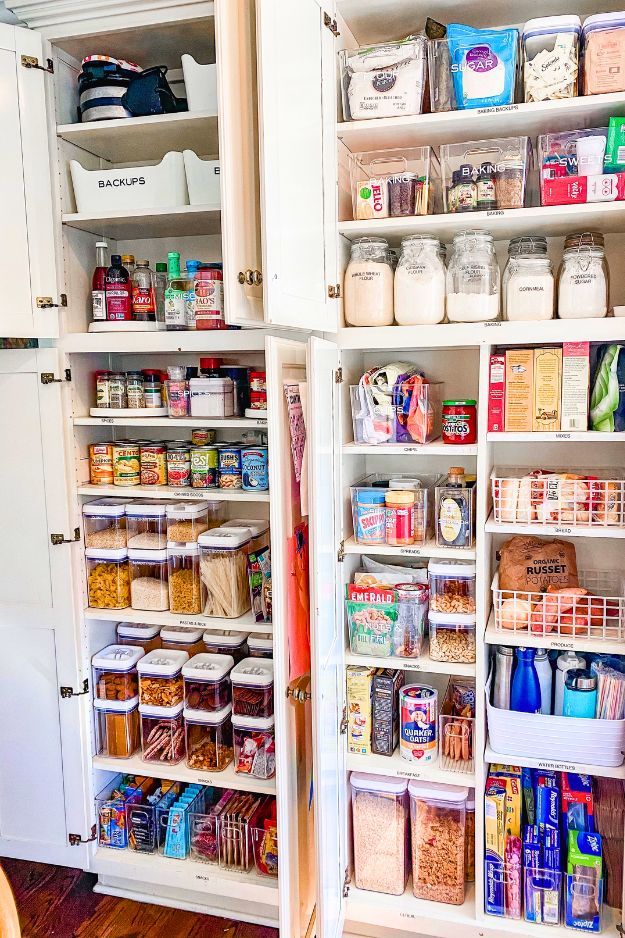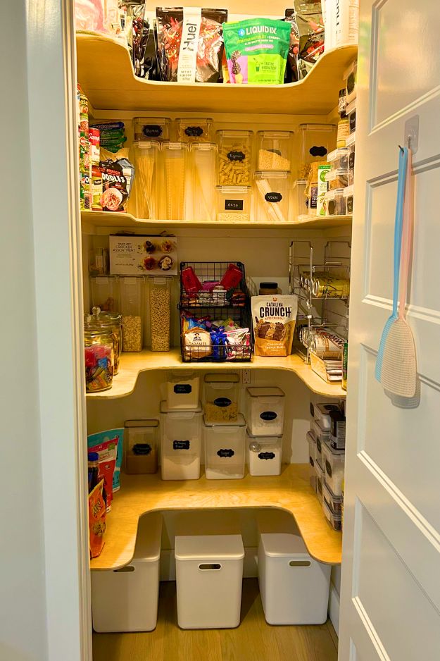 I’m kind of obsessed with how this pantry feels both hyper-organized and very human at the same time. You can tell the homeowner designed it for a real brain, not just for aesthetics, with clear baking, breakfast, snack, and pasta zones that actually make putting groceries away less annoying. The DIY built-ins made from basic bookshelves plus trim are such a smart, budget-savvy flex, and I love that most of the bins came from places like Dollar Tree instead of some overpriced organizing store.