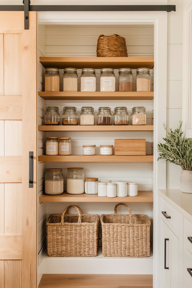 The sliding barn door is already doing half the work here because it makes the pantry feel like a little “hidden shop” inside the kitchen. I’m also fully on board with the repurposed jar vibe, and this setup nails it. Same-size jars up top for the clean look, smaller ones in the middle for everyday stuff, and those two big woven baskets at the bottom for the “toss it in and move on” category. It’s warm, simple, and so easy to keep organized because you can actually see what you have.