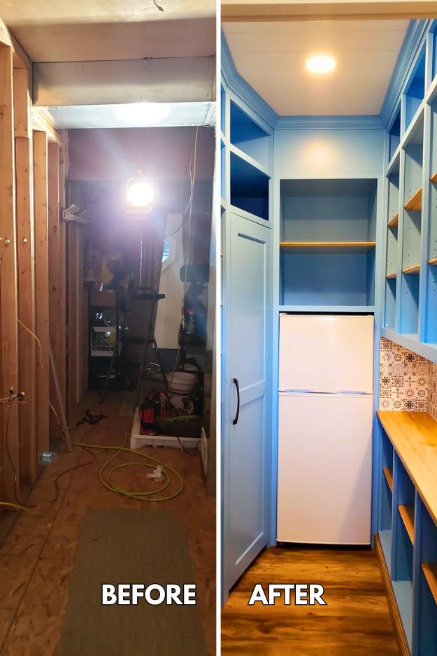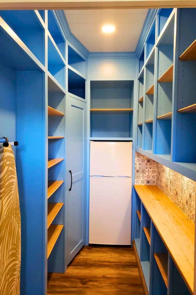 That soft blue paired with the Moroccan-style tile feels calm, classic, and quietly special. It also functions without looking industrial. Shallow shelves, built-in counter space, even room for a fridge and cleaning supplies. I’d steal this whole layout in a heartbeat if I ever get the chance.