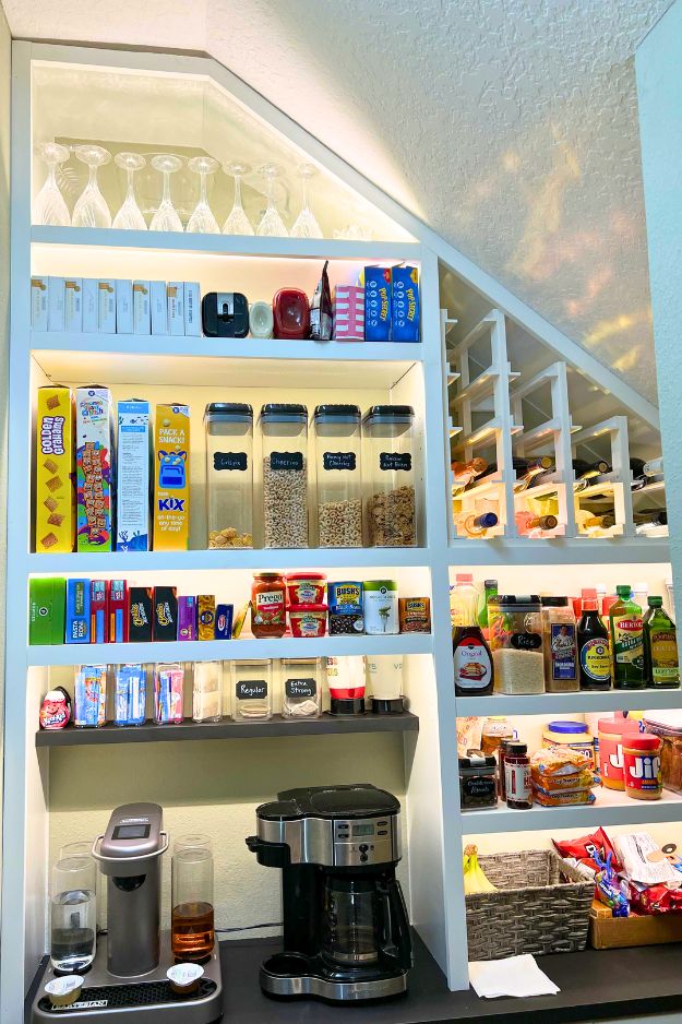 I also love that the wine rack is PVC and lit from below. Also, motion-sensor lights that idle at 5% and brighten when you walk in? Yes please. If you want pantry lighting that feels fancy but still practical, this setup is the blueprint.