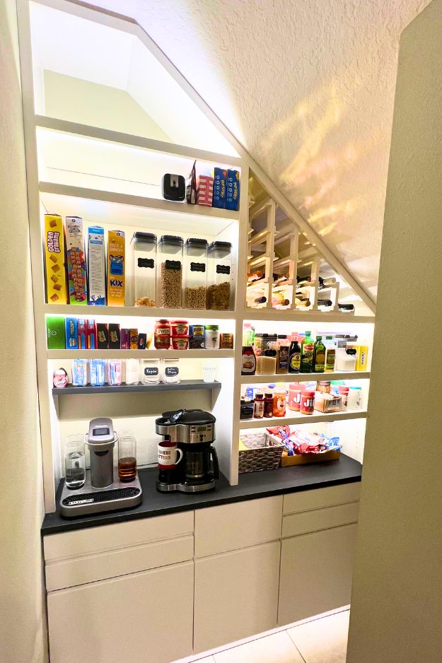 I’m kind of obsessed with how sneaky-smart this is because it turns literal dead wall space into real, usable storage. I love that it adds a ton of storage without stealing an inch of walking space, which is honestly the dream in tight pantries. The staggered depth so you can see labels is such a small detail but makes it feel thoughtful, not just clever. By AtomicDairy
