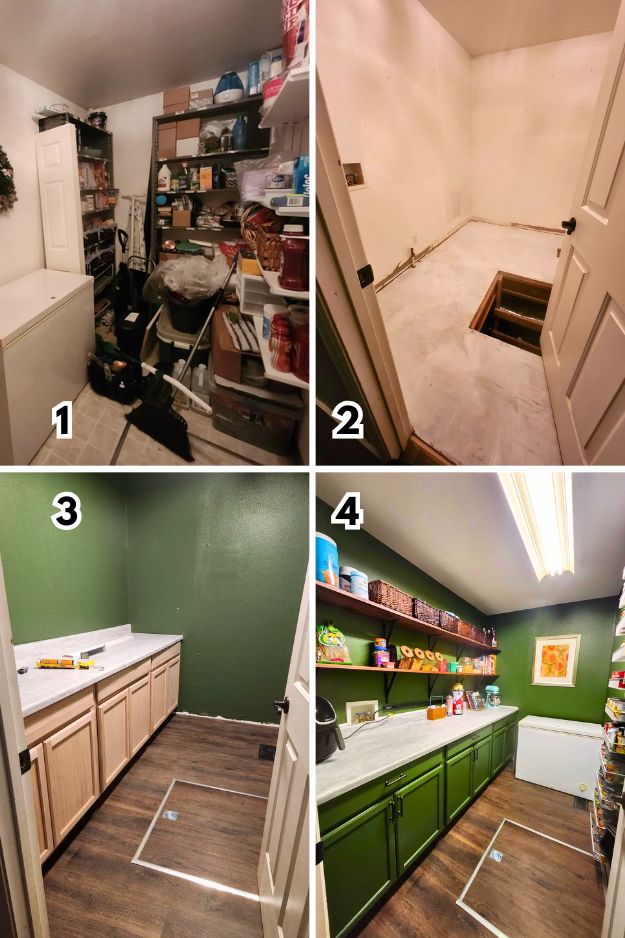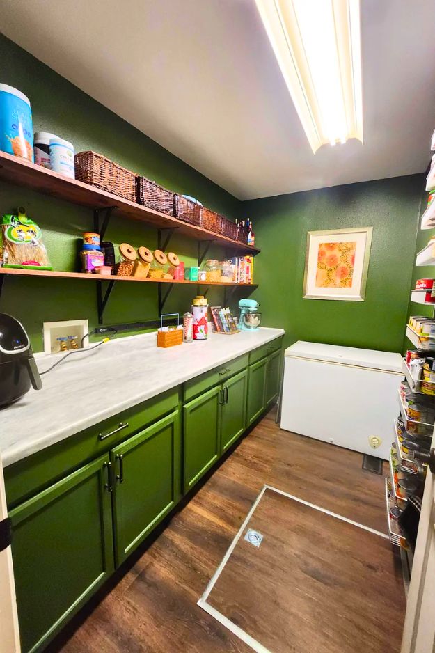 u/Fayebuist really said “enough is enough” and turned a sad, awkward pantry into an actual room you want to show off. That deep green (Behr Cypress Vine) makes everything feel moodier and more intentional, and the new shelving/cabinets finally give the space a proper flow.