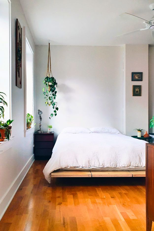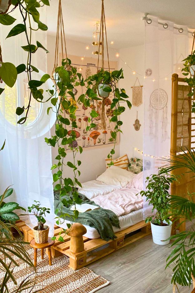 What really stands out in this little apartment is how a simple color scheme of white, green, and natural wood can transform a cramped room into something fresh and springlike. The ivy and hanging plants soften the edges, while the mushroom tapestry and playful bedposts add a quirky touch that keeps it from feeling too minimal. I like that the bed sits on shipping pallets, it’s rustic, affordable, and ties right into the earthy palette.