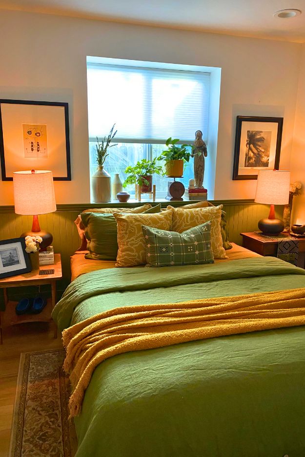 This bedroom works because of its balance of colors, muted linens, earthy green touches, and mustard shade. It’s a palette that feels both cozy for winter and fresh enough for spring. The layers of fabric and pillows make the bed look like it’s waiting for a long nap, but nothing feels fussy. I like that the lamps and side tables aren’t perfectly matched; it gives the room character.