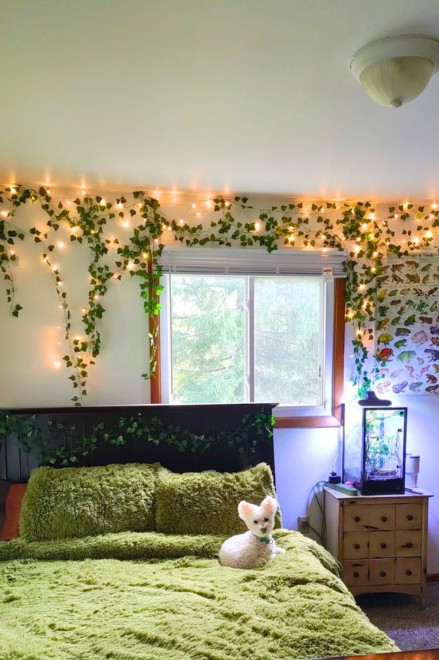 I swear there’s something about pairing pothos with string lights, they show up everywhere, and for good reason, because they instantly make a room feel cozy. u/Donglecochin’s bedroom takes that idea and runs with it: mossy green bedding, ivy garlands, a frog poster, and even a little terrarium with an actual tree frog. The best part is Puffin, the pup who practically disappears into the bedding.