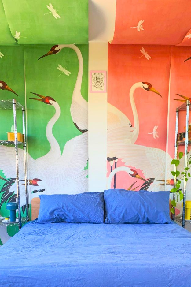 plantchris’s bedroom is such a wild mix of color and pattern. The Gucci heron wallpaper draped like a tapestry instantly sets the tone, and instead of matching it with something neutral, they went with bold blue bedding that clashes in a way that somehow works.