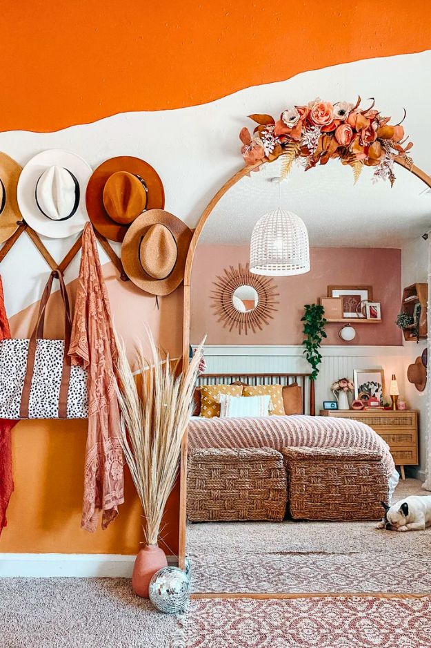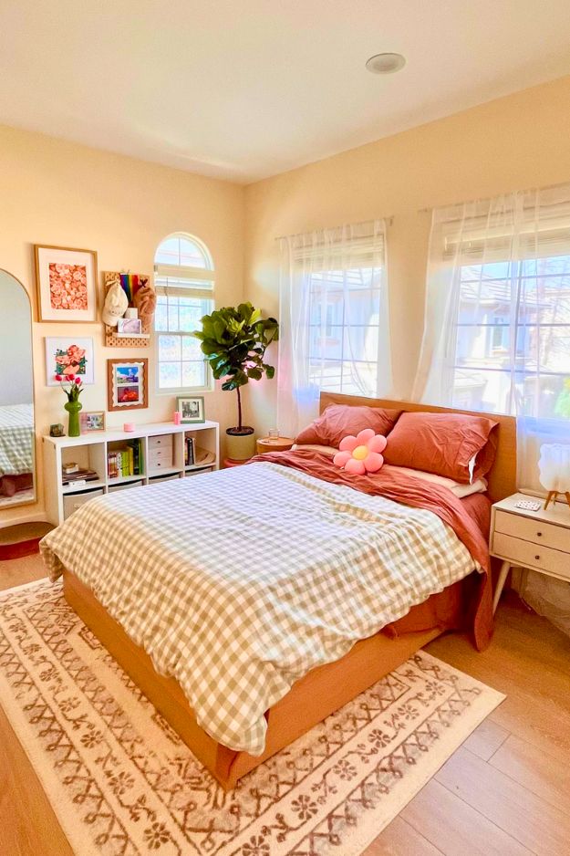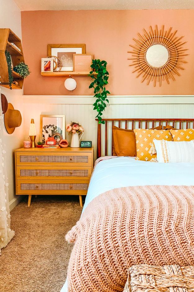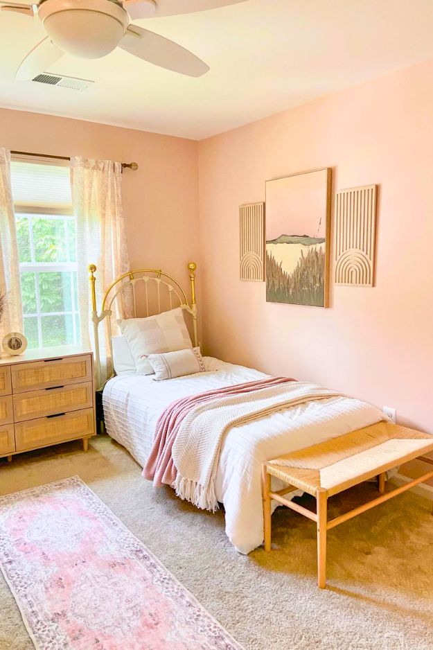 u/pizzainertia’s “spring refresh” really shows how much color can change a standard base housing bedroom. The Behr Retro Pink wall sets such a soft backdrop, and then those squiggly painted stripes in orange and apricot bring in the playful energy of spring without overwhelming the space.