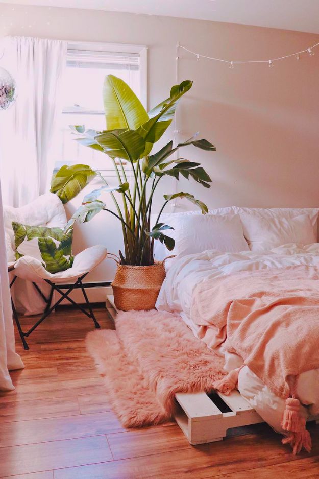 I’ve seen this “refreshing bedroom” pop up a few times, and honestly, I get why. The color palette leans into those soft blush pinks that instantly feel spring-ready. I swear there’s something about vines or big leafy plants mixed with warm lights that always makes a room feel inviting, and this setup proves it.