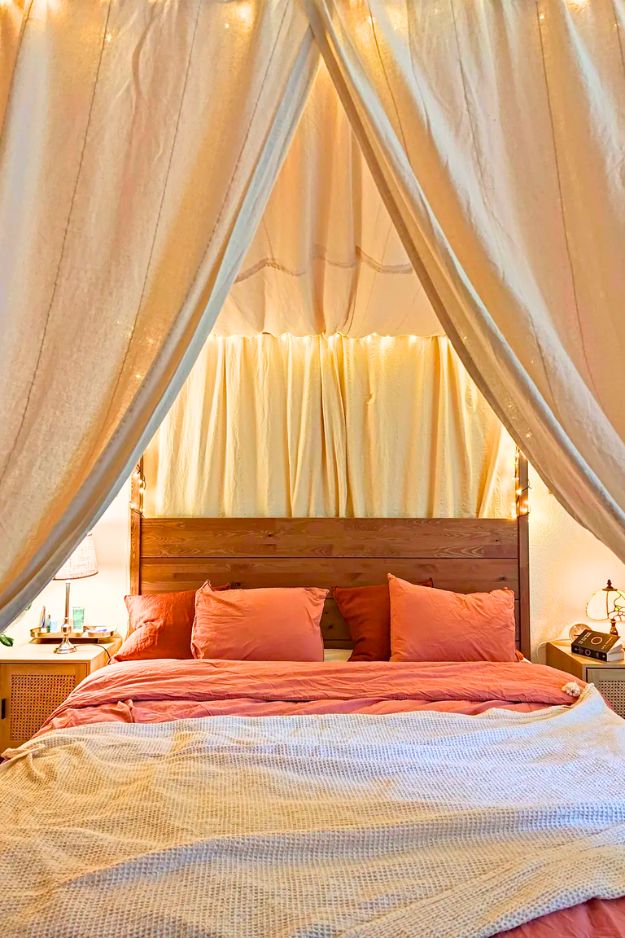 I’m jealous of u/localbestie’s bedroom because that canopy setup is straight out of a spring mood board. It’s actually DIY, she sewed together curtains and draped them over an Ikea YTTERVÅG frame, so the whole thing feels airy and soft without being fussy. Pair that with linen bedding and fairy lights, and you’ve got the kind of palette that makes the room glow in warm neutrals.. It’s practical too, since the fabric can be pulled down for washing.