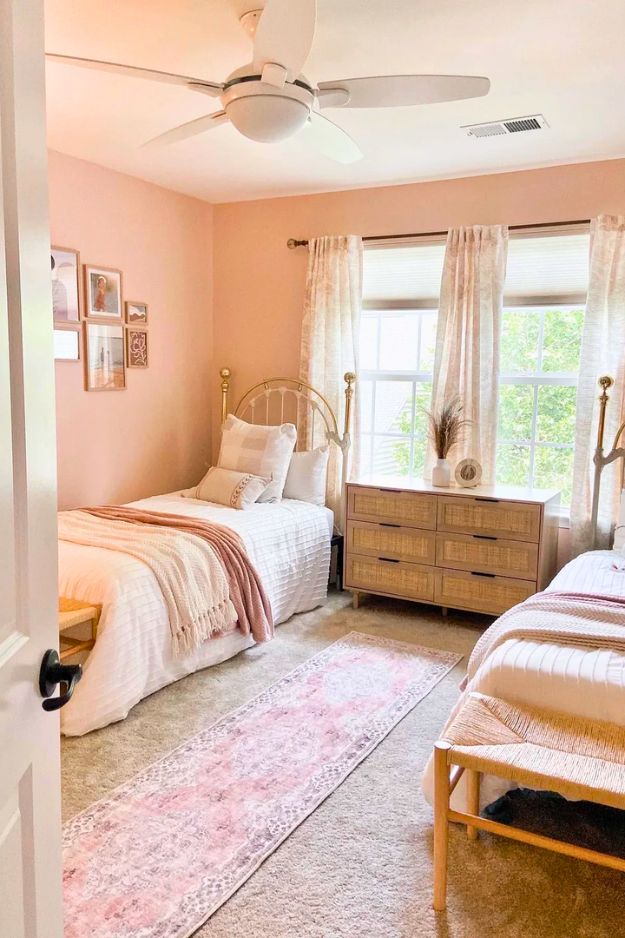 The walls are painted Coastal Cottage by Benjamin Moore, which lands somewhere between blush and peach, and it pairs so well with the antique gold-and-white headboards that were pulled out of storage. The curtains are just simple Target finds, but they frame the room perfectly.