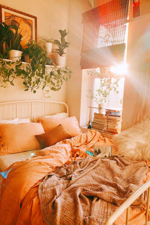 That sunset glow in u/goldasaurr’s bedroom is doing most of the decorating work here. The whole room shifts into this warm, golden palette that plays so well with the soft neutrals and leafy greens.