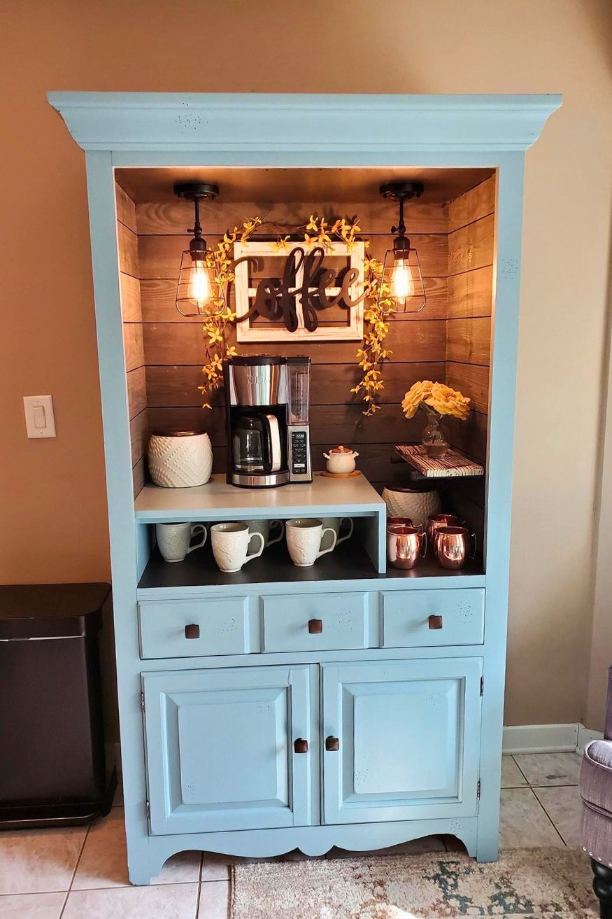 Gillygone said his wife found this on Facebook, and they really like it. This inspired him to turn an old TV armoire into a tiny caffeinated hideaway. It’s cozy without needing a whole themed room. The duck-egg cabinet color, the little vintage-style lights, and even the Moscow mule cups make it feel styled but still functional.