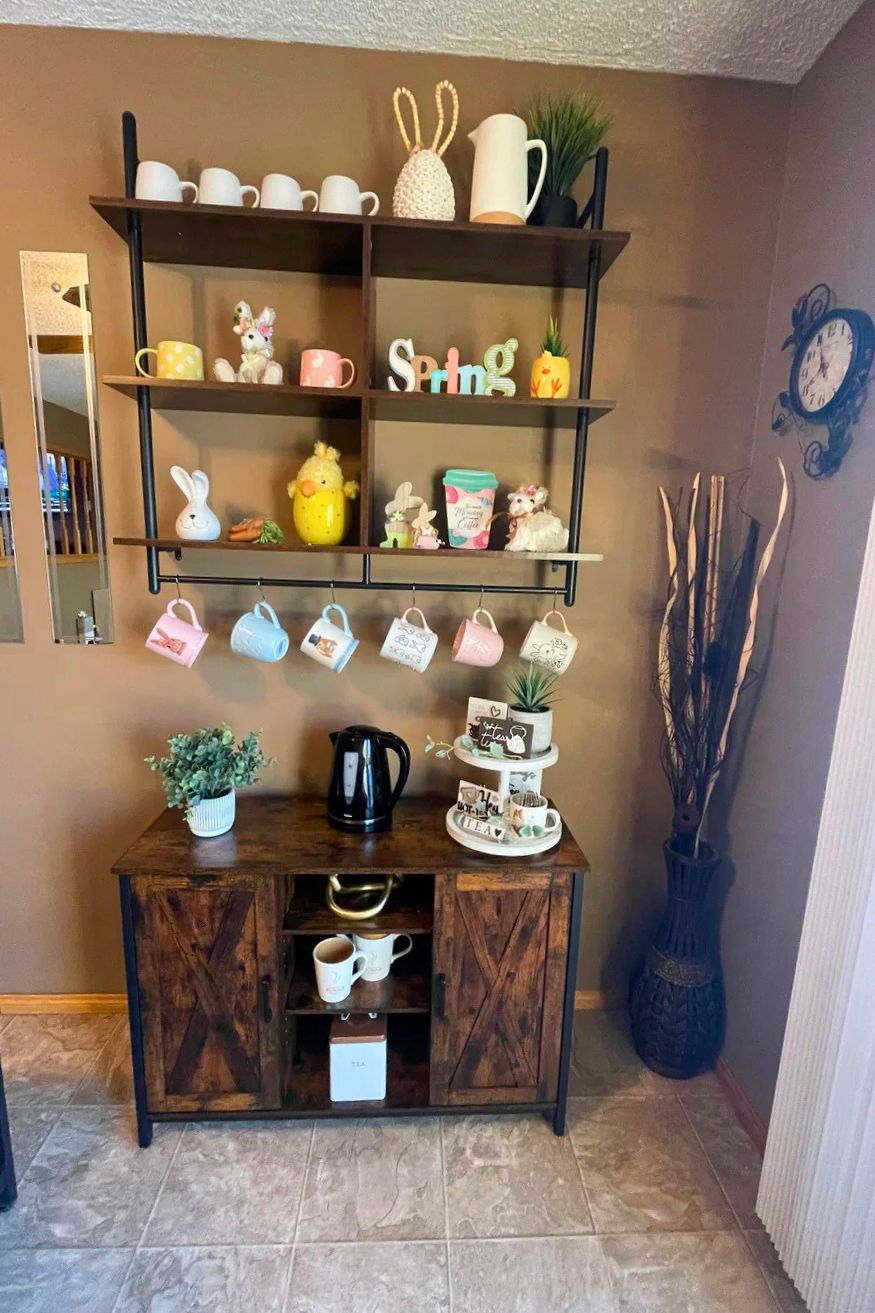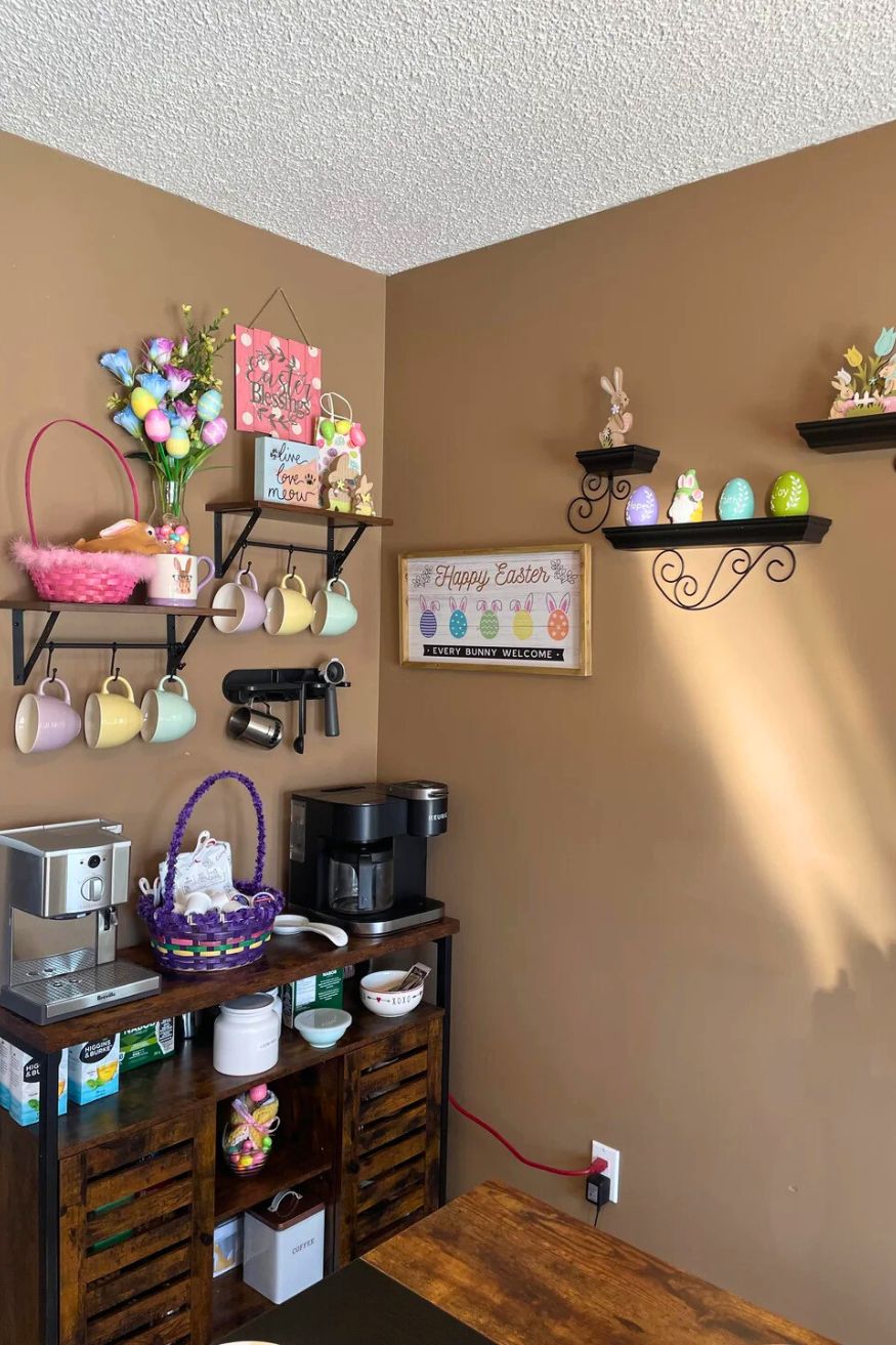 u/HALOsashapoo0204 even made use of two of his corners to transform them into coffee bars for spring. The shelves are styled so nicely with the bunny decor and soft pastel mugs. I like the mix of dark wood and black metal since it grounds all the playful spring pieces, so it doesn’t look too sugary.