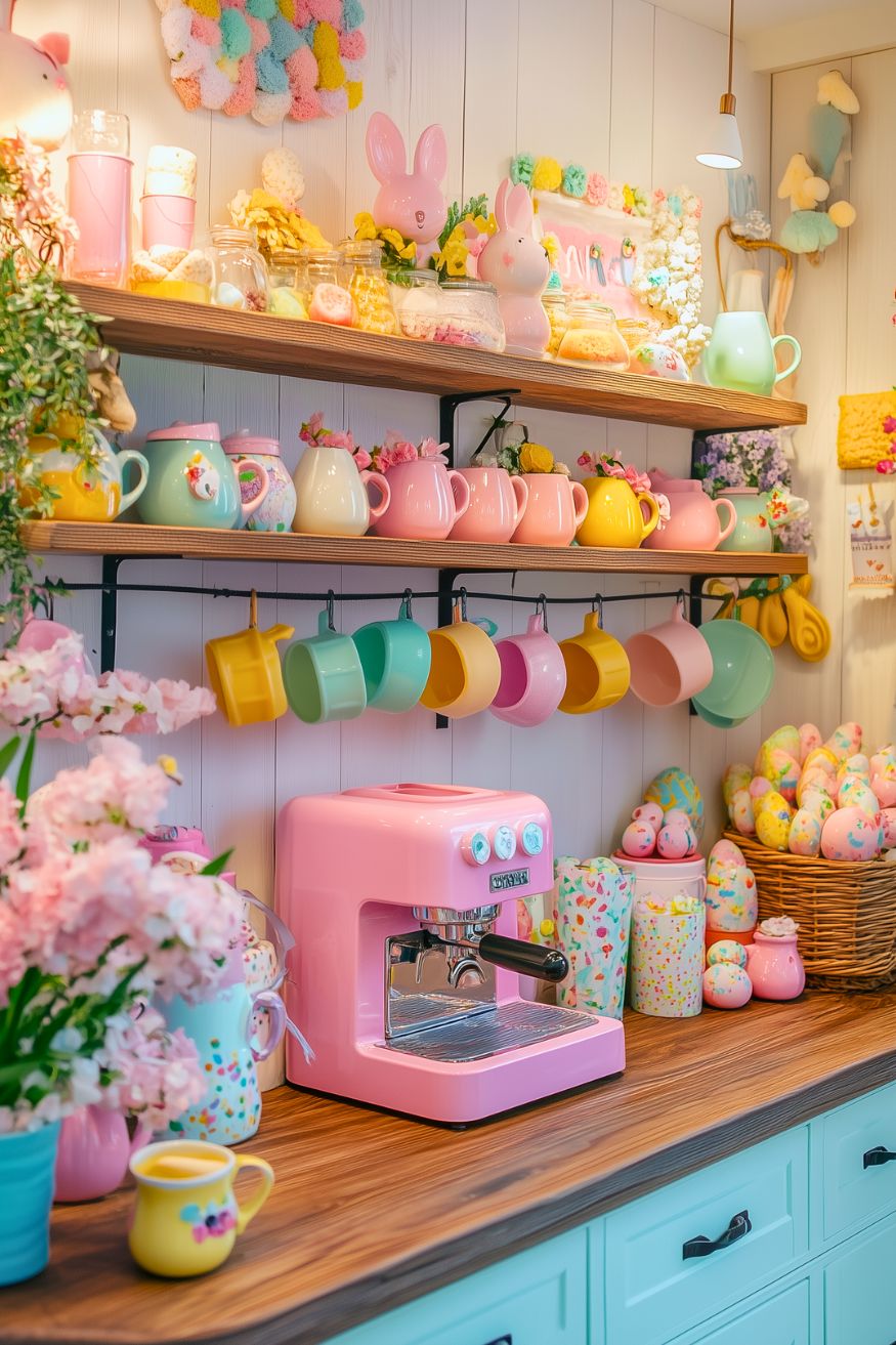 This one will work so well if you’re a fan of maximalism. It’s actually a spring coffee bar with the highest volume. And I’m just secretly obsessed with it. The pastel mugs, candy-colored eggs, and that bubblegum pink espresso machine make the whole space feel like a tiny Easter café popped up inside someone’s home. It’s overwhelming in the best way.