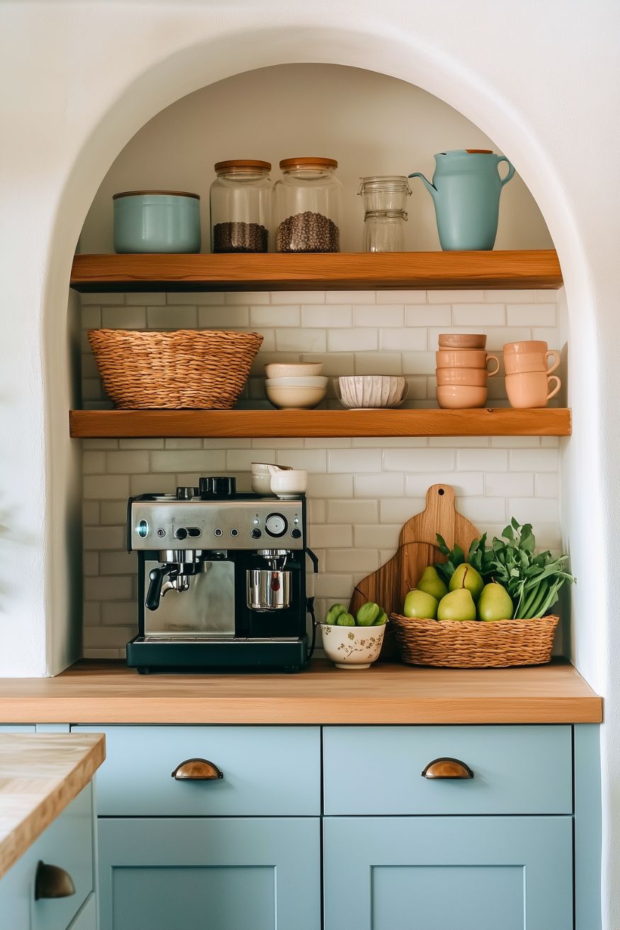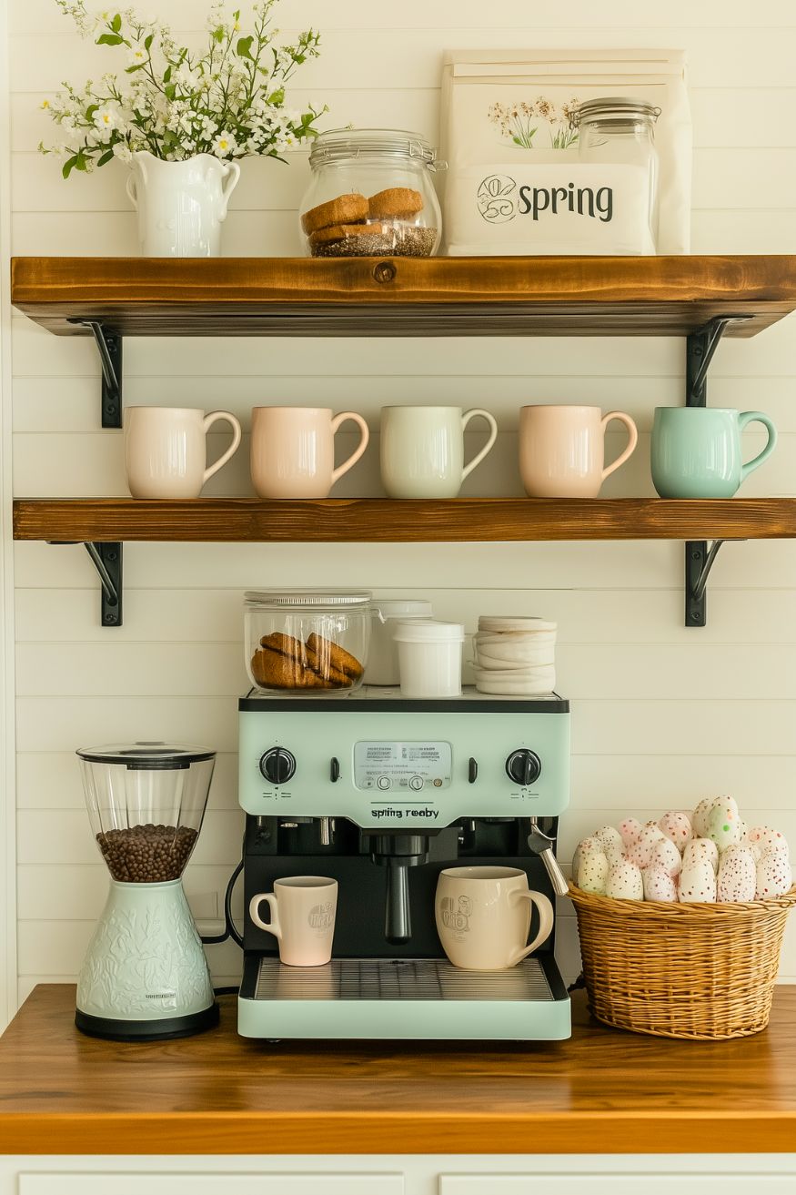 This could be my favorite one. It has that perfection, but in the simplest way. The pastel mugs lined up on the wooden shelves feel cheerful but still clean and organized. And that mint espresso machine totally stands out from the whole setup. It’s the kind of coffee bar that makes you want to slow down and enjoy your spring morning.