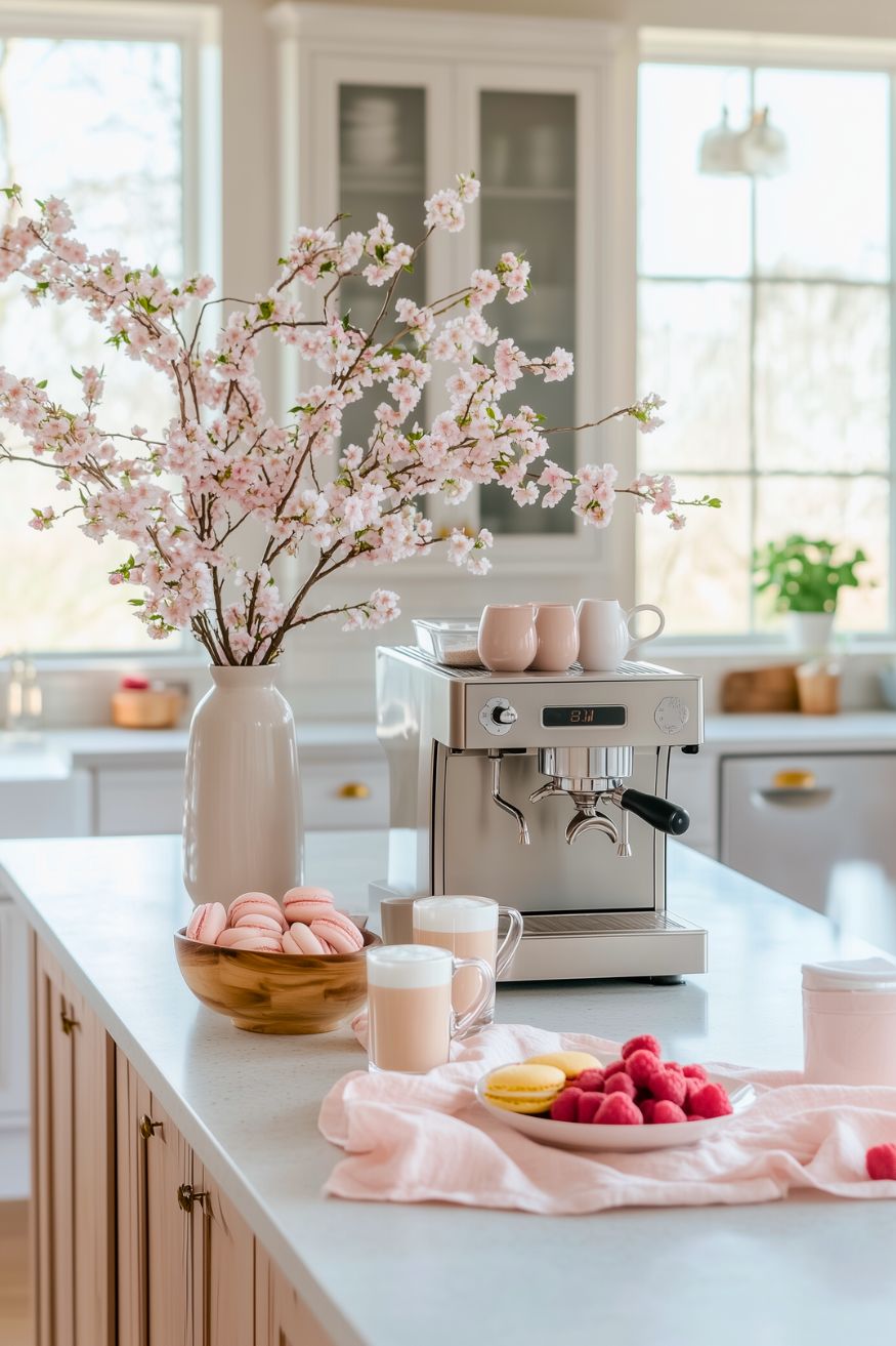 If my house is big enough to have a kitchen island, I would definitely mimic this one. The cherry blossoms are way too beautiful for spring, ngl. It softens the whole kitchen and makes the coffee setup feel romantic without being over-the-top.