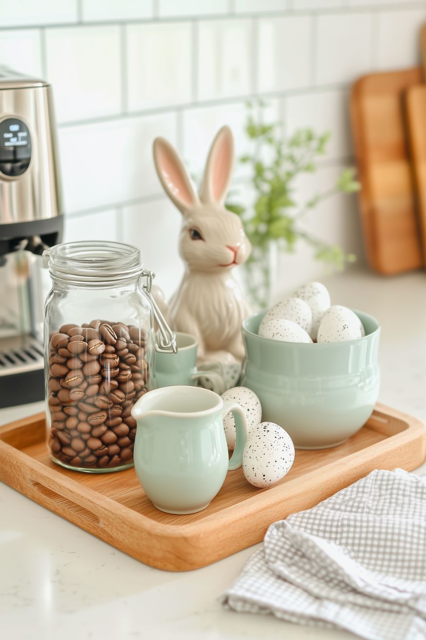 Easter bunnies can never go wrong in spring. I love how the speckled eggs add a soft Easter touch without turning the whole counter into a themed display. It’s cozy, clean, and totally doable on your own.