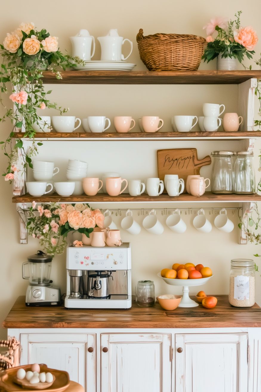 Honestly, this is the kind of coffee corner that makes you want to slow down and make your drink properly, not just rush out the door. The trailing greenery with peachy roses makes the shelves look like they’re blooming on purpose. And it also has that feeling of everyday touch, not just the seasonal vibe.