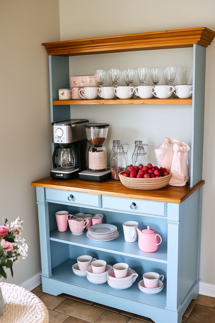 This coffee bar is proof you don’t need a million decorations to make spring feel “here.” The soft blue cabinets and warm wood shelves already give it that fresh, calm vibe, and the styling stays so clean. Everything seems to be set intentionally.