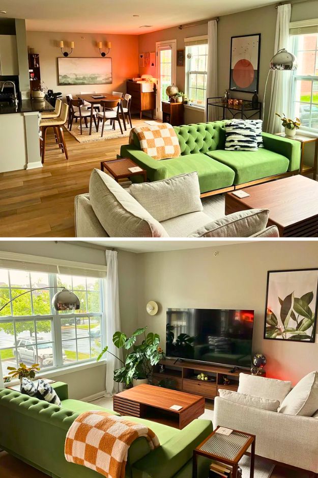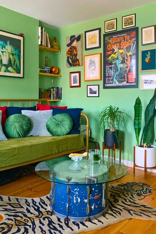 It’s not just the color you choose, but what you pair it with that sets the tone. shaunpendy’s place is such a good example, the green sofa and rug could have gone playful or trendy, but mixing them with all those wood accents makes the space feel more masculine and grounded, almost like a forest lodge brought inside.