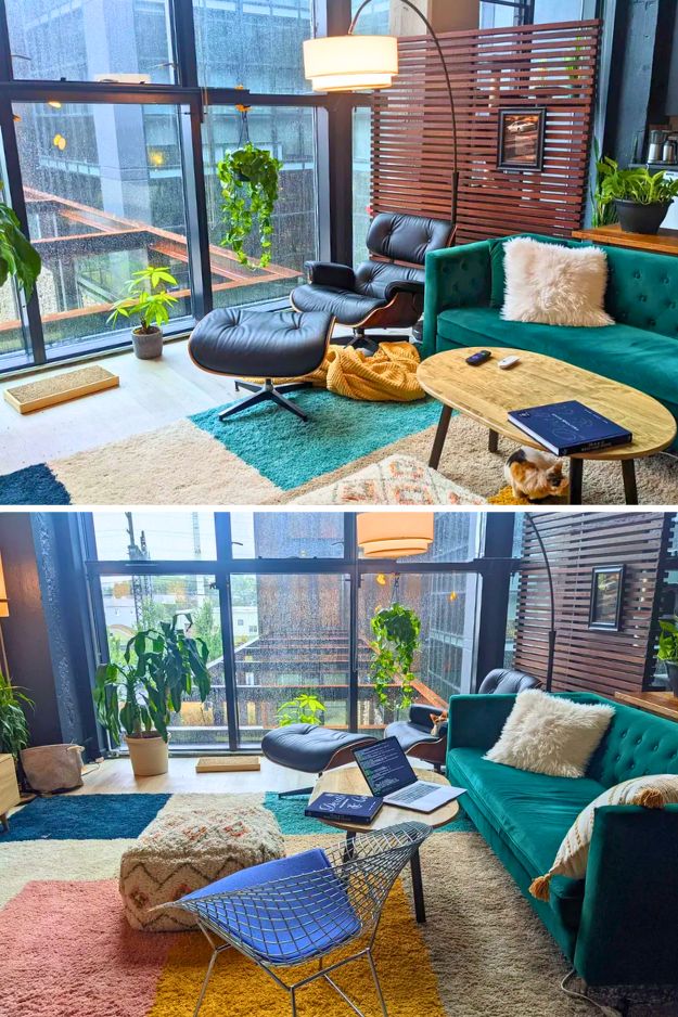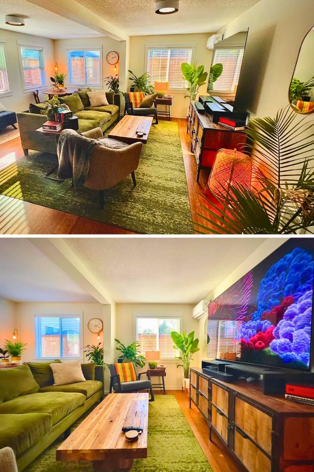 There’s something about the rain that makes this space feel even warmer, and u/JackofAllSuedes’ living room nails it. The green sofa, plants, and patterned rug all echo each other, pulling the space into one cohesive palette, and honestly, it would feel so lost without that rug grounding everything.