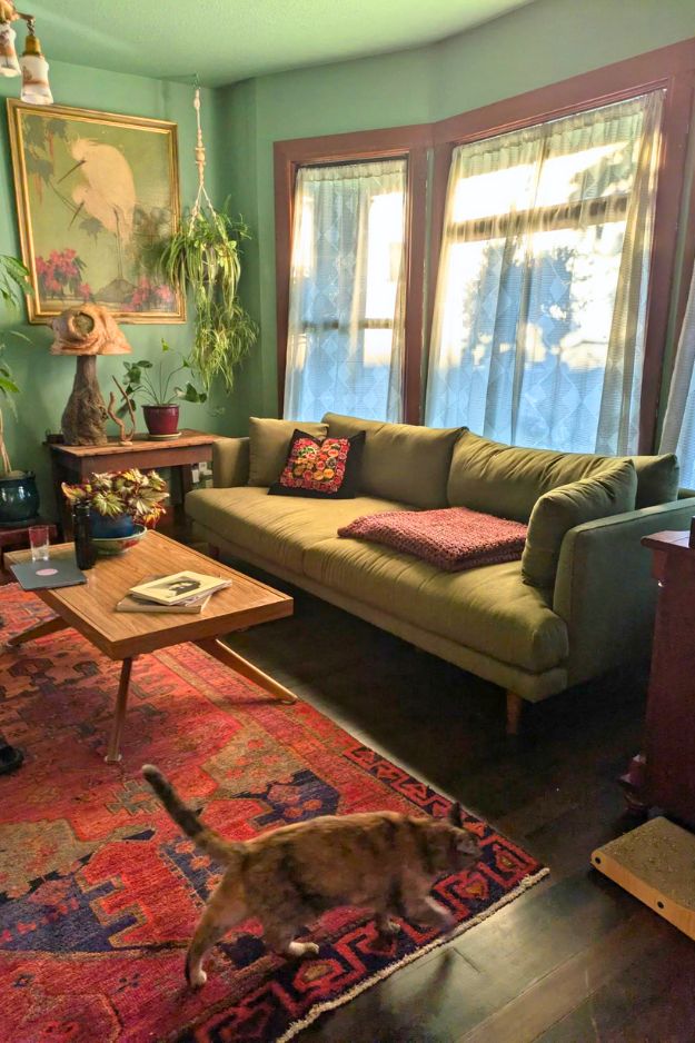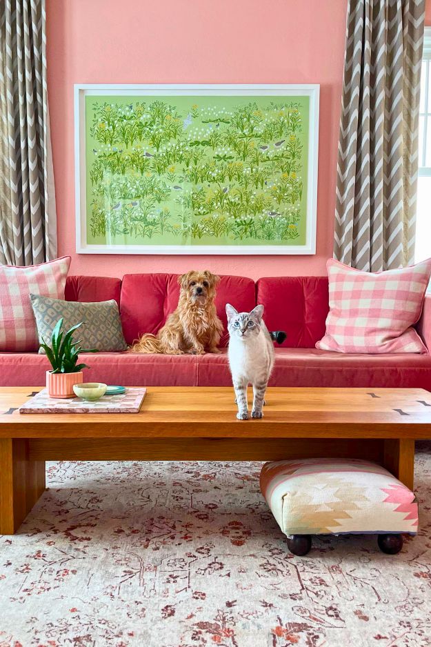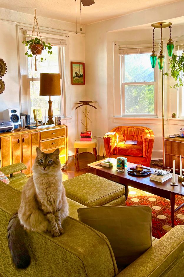 The fact that the coffee table was handmade by her dad is such a cool touch, and the cat and dog just hanging out on top make the whole space feel extra lived-in and warm.