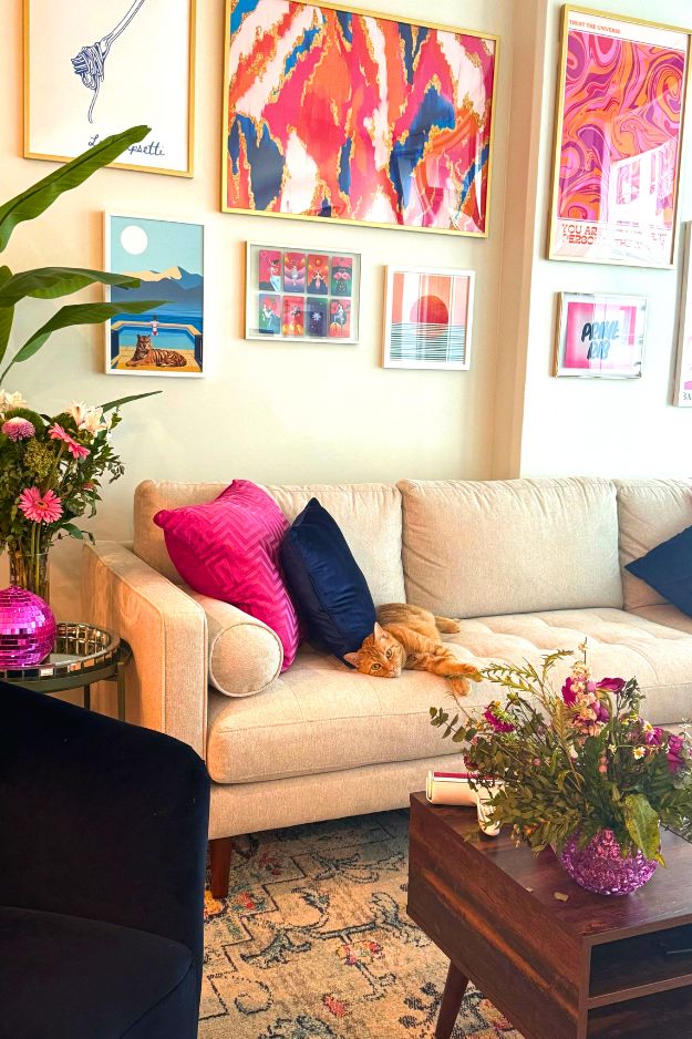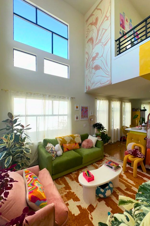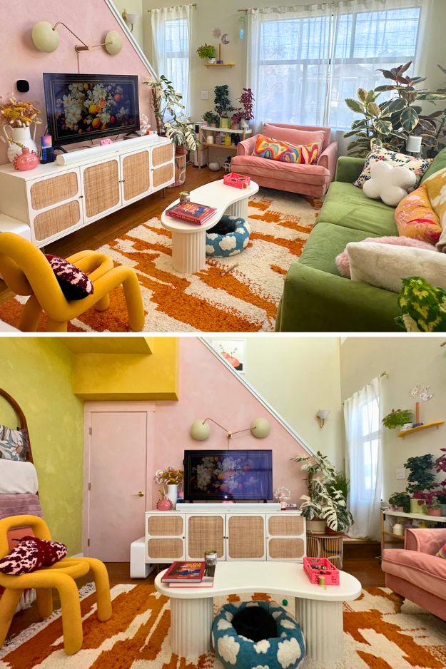 This space feels like the perfect mix of soft and bold, pinks and oranges layered with cozy neutrals, it feels personal without being overwhelming. Looking at it made me imagine how stunning a hot pink couch would be here, it would turn the whole room into a statement space while keeping that same vibrant, happy energy.