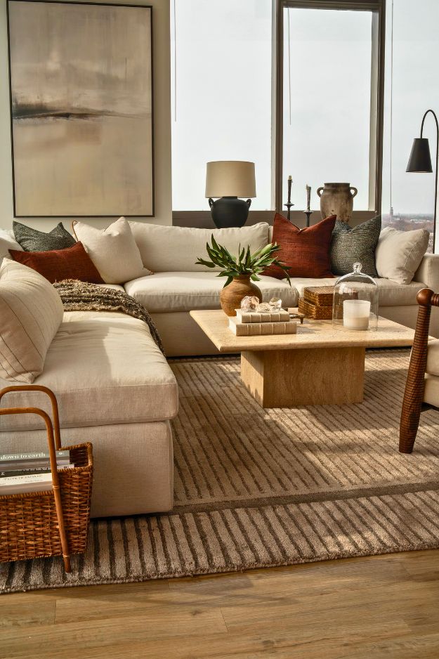 I literally thought this one was a render, that’s how polished and intentional this space feels. It’s calm, orderly, and full of texture without ever being busy. The neutral rug from the Bobby Berk Karastan collection ties everything together, while the burgundy pillows and greenery keep it from feeling flat. By u/rustandtrust