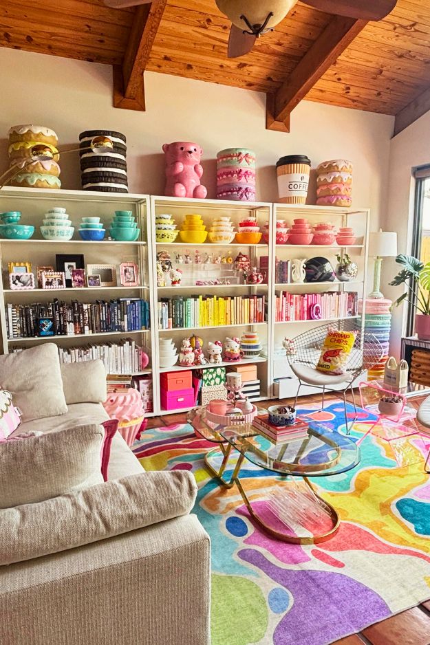 I agree this is a bright ass living room, but it’s so pretty it feels impossible not to smile. The rainbow Pyrex, colorful books, and food-themed stools are pure joy, and that wavy Wayfair rug pulls all the shades together like it was meant for this space. Even with so much going on, it feels balanced. Credits to u/pastrywhipped
