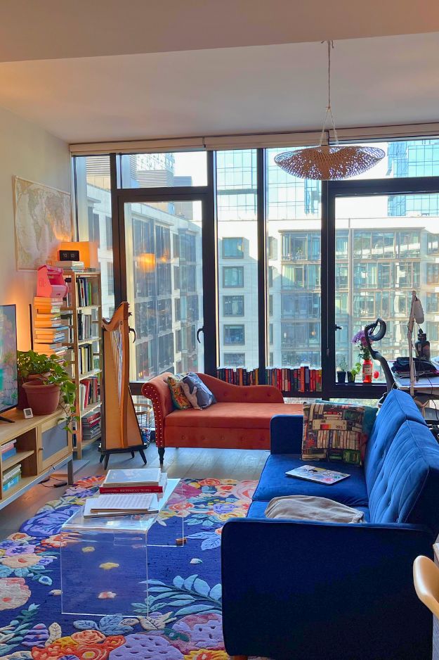 It must be one of the rare times I see a harp in a living room like this and somehow it feels right at home here. u/Taborask’s Brooklyn space is a mix of bold and cozy, with that dreamy blue velvet sofa, pink chaise, and the floral tufted rug tying everything together. The giant windows pour in light, making the whole room feel open and alive.