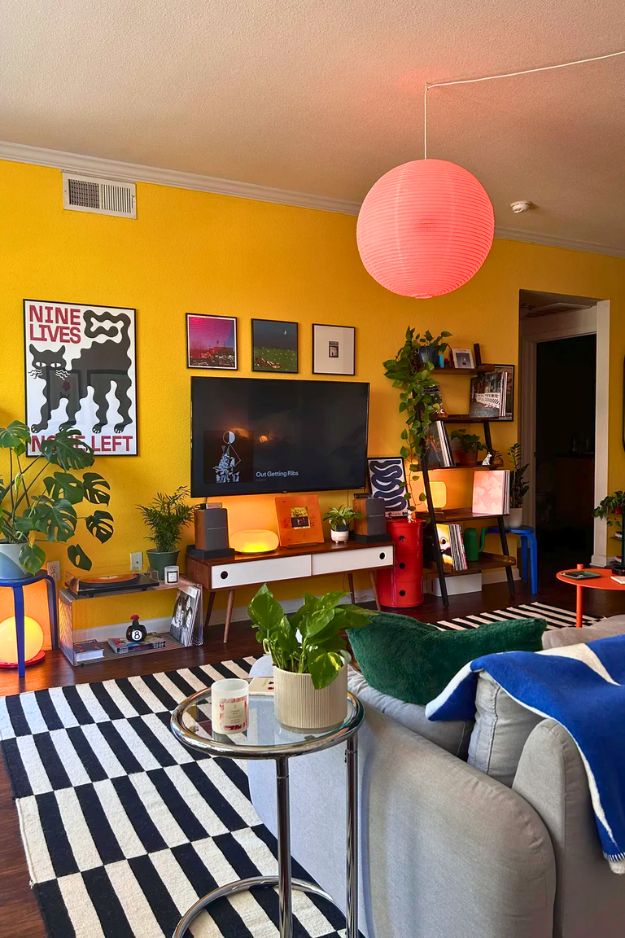 Kudos to u/rincon36 for pulling off such a fun Denver apartment. The bright yellow wall and orange side table bring the boldness, while the IKEA Stockholm rug keeps it grounded. The plants, layered lighting, and music posters make it feel like a true hangout spot rather than just a styled space.