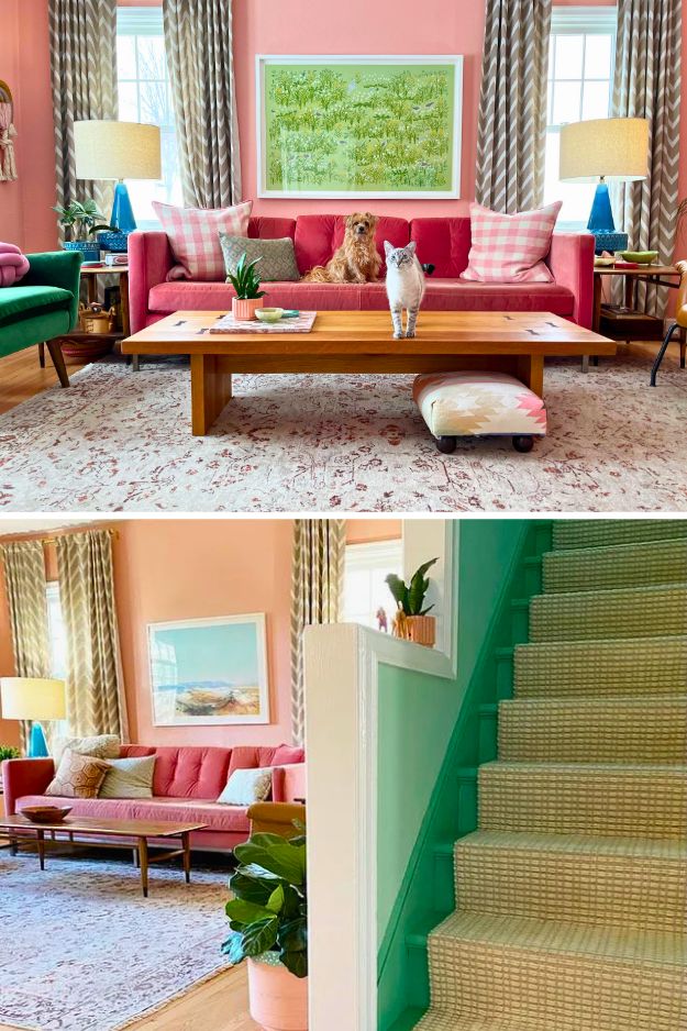 u/Pinkpurplegreentea’s living room straight up looks like it could be in a magazine, but in the best, not-too-perfect way. The peach walls and pink velvet sofa make it feel soft and cozy, and that green print keeps it from getting too sweet.