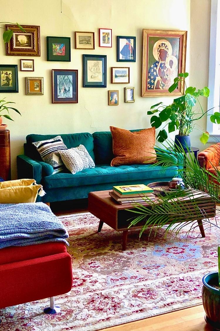 I’m digging the retro and mid century vibes in this nine_of_cups’ Greenville living room. I mean look at the perfect mix of green and orange, and how it combines with the tension-pole lamp, thrifted orange chair, and patterned rug. Every detail works together to give the space a warm, nostalgic feeling without feeling stuck in the past.