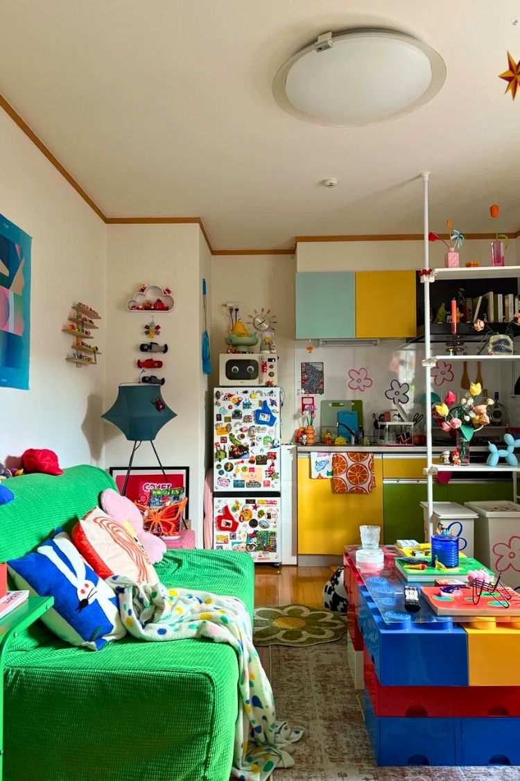 This Tokyo apartment makes me feel like I’m looking at a giant Lego house for adults. Every corner is filled with color and personality, from the Lego coffee table to the googly-eyed pillowcases and Pikmin vase. It’s maximalist but intentional, so all the playful elements work together instead of feeling messy. I love how the bright palette makes the white walls feel like a gallery backdrop too.