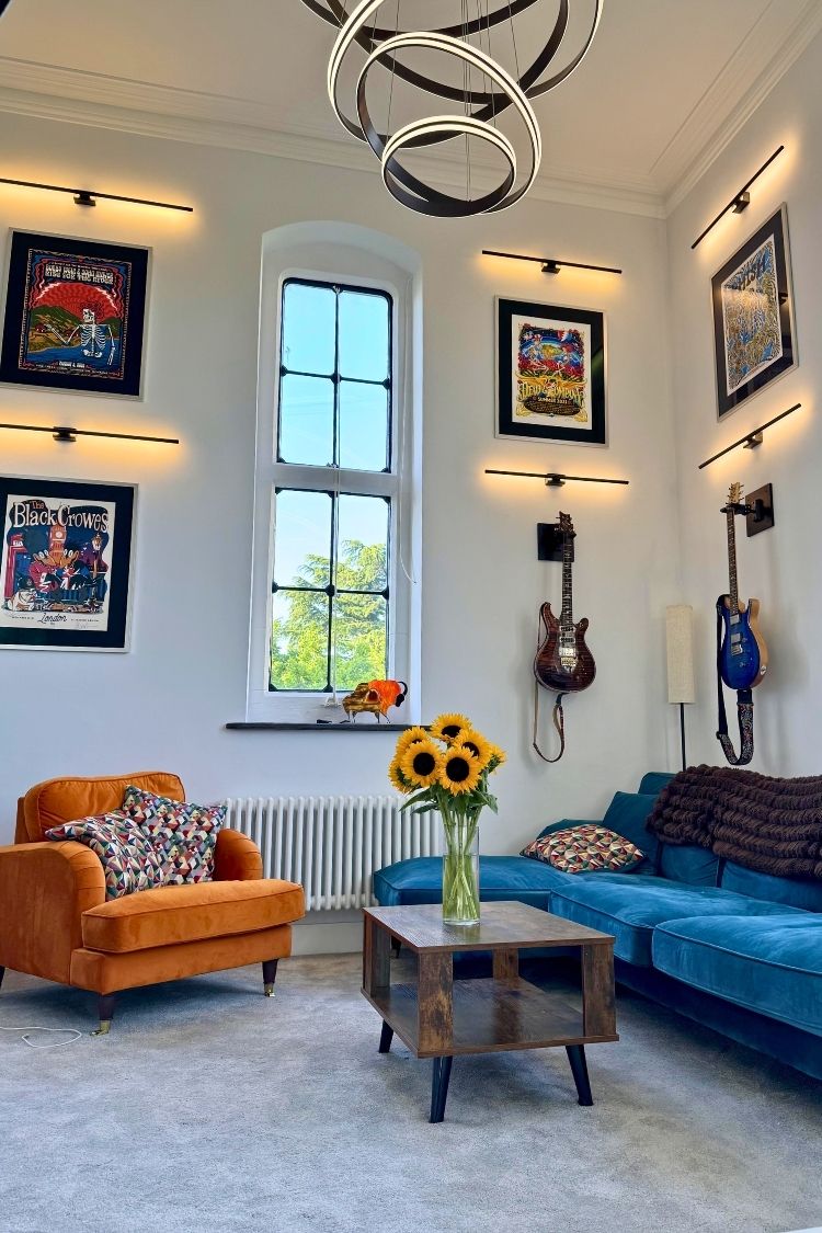 This space from u/diceberg is such a strong “post-divorce glow-up”, with high ceilings, guitars and those lit gig posters bringing the perfect concert vibe home. The blue-and-orange combo with the sunflowers keeps it warm too. That said, it still feels just a bit vacant. A big, textured rug would tie all these great elements together so the room feels fully lived-in.