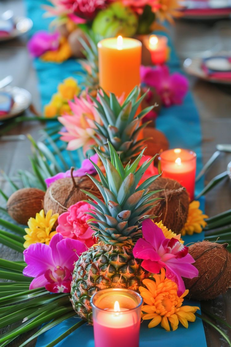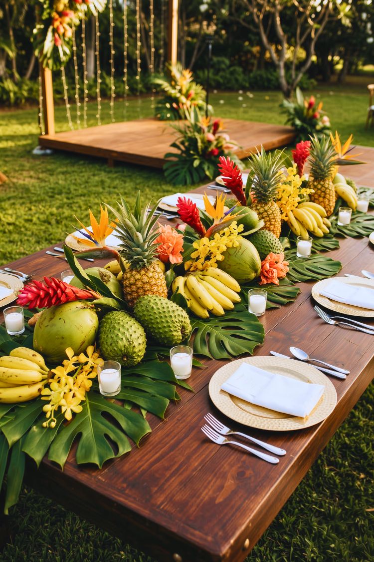 A full tropical spread runs right down the center of the table here. Pineapples, bananas, coconuts, and bright flowers sit on top of large monstera leaves, turning the whole runner into a lush island-style display. Even with all the color and fruit, the setup still feels natural and relaxed. Small candles tucked between the fruit add a soft glow without taking attention away from the centerpiece.