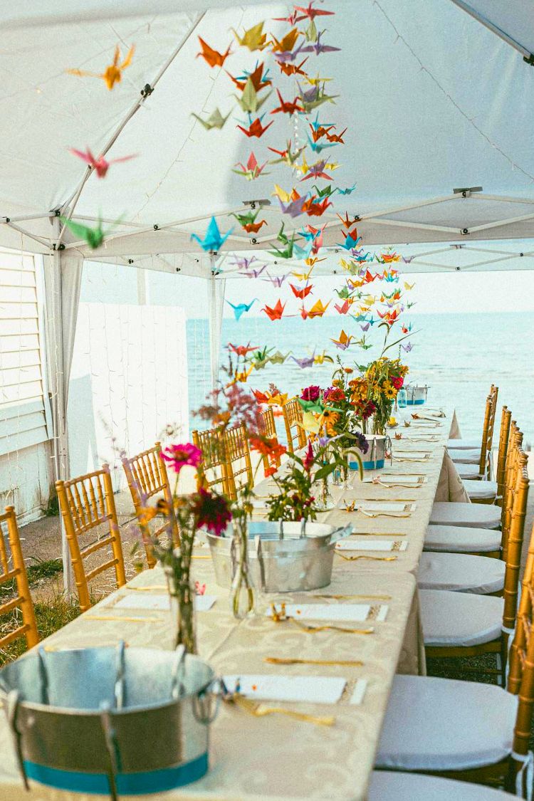 The first thing that caught my eye here wasn’t the table, it was the ceiling. Those colorful origami cranes floating above the table make the whole setup feel playful and surprisingly elegant at the same time. I love how the long table is kept fairly simple with small flower arrangements and soft linens so the hanging colors can really shine.