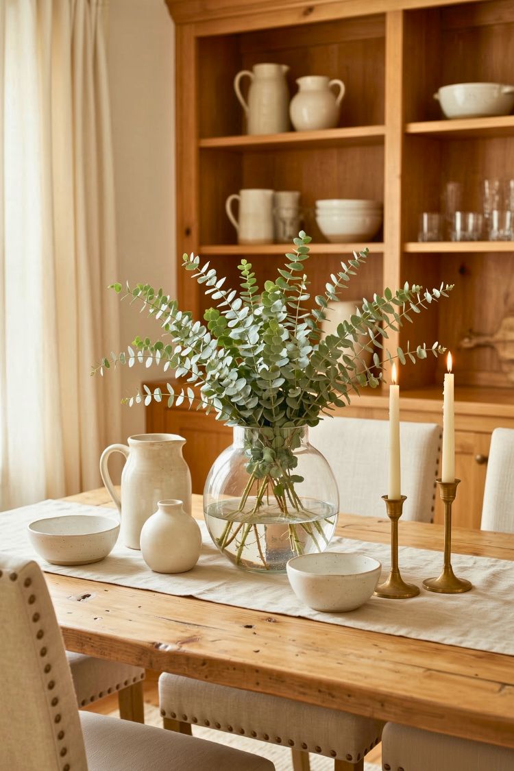 This one feels so calm compared to the bright tropical setups. Just a bunch of eucalyptus stems in a simple glass vase and somehow the whole table looks thoughtfully styled. I like how the greenery spreads out wide but still keeps the table usable.