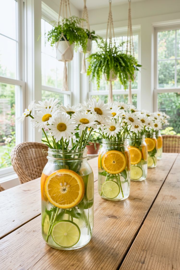 At first glance it looks like simple mason jar flowers, but the citrus slices inside the water completely change the vibe. The oranges and limes add color without needing a big floral arrangement, and the clear glass lets everything show through in a really fresh way. I’d definitely borrow this trick of dropping citrus slices into the water because it instantly makes a basic jar arrangement feel summery.