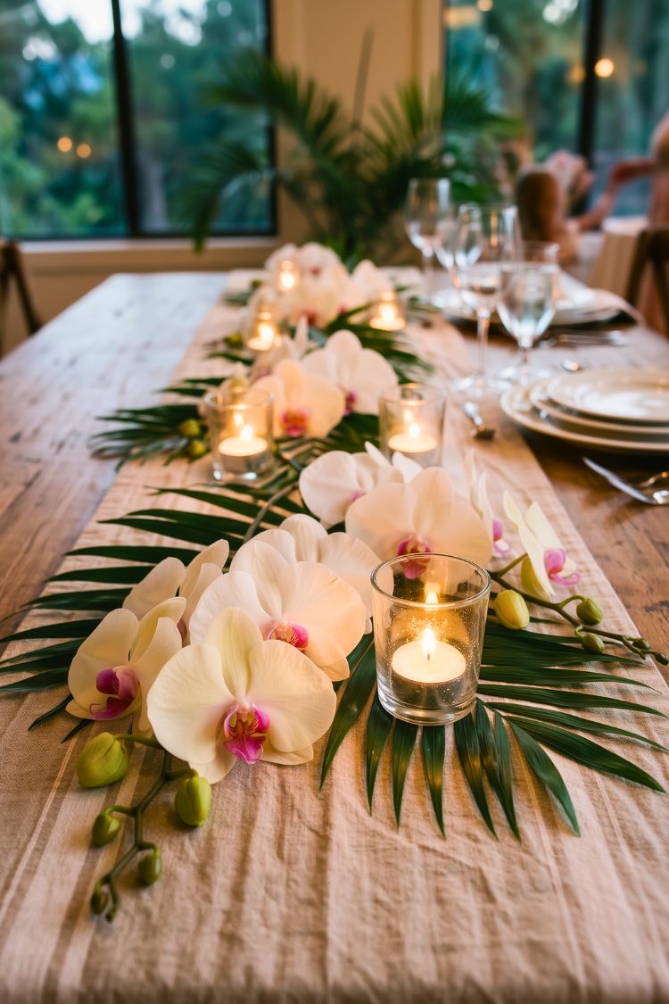 I feel like this one leans much more toward a formal setting. The orchids, palm leaves, and small glass candles create a clean, elegant runner that looks polished without feeling heavy. Everything sits low and evenly spaced, which keeps the table open and comfortable for conversation. It still has a soft tropical feel, but in a much calmer and more refined way compared to the brighter, fruit-filled centerpieces.