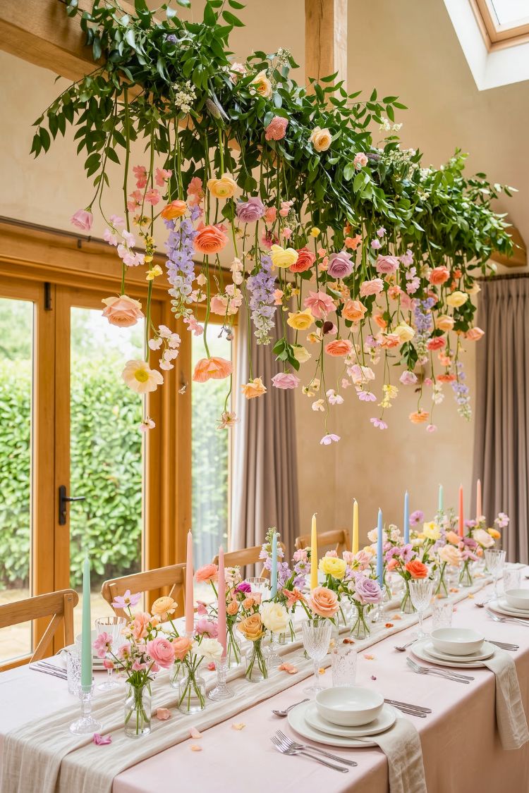 This setup made me look up before I even noticed the table. The flowers hanging from the beam almost feel like a floating garden, and the mix of soft pastel blooms keeps it from feeling too heavy overhead. Down on the table, the tiny bud vases lined up with colorful taper candles create this nice rhythm that guides your eye down the whole length. Nothing is bulky, which makes the space feel airy even with so many flowers.