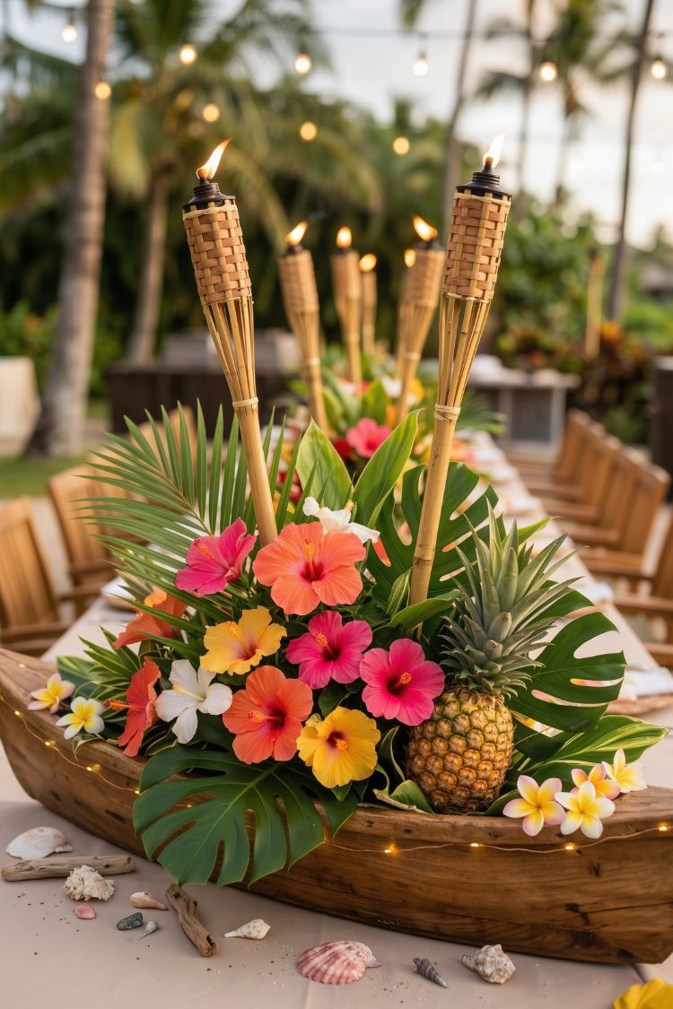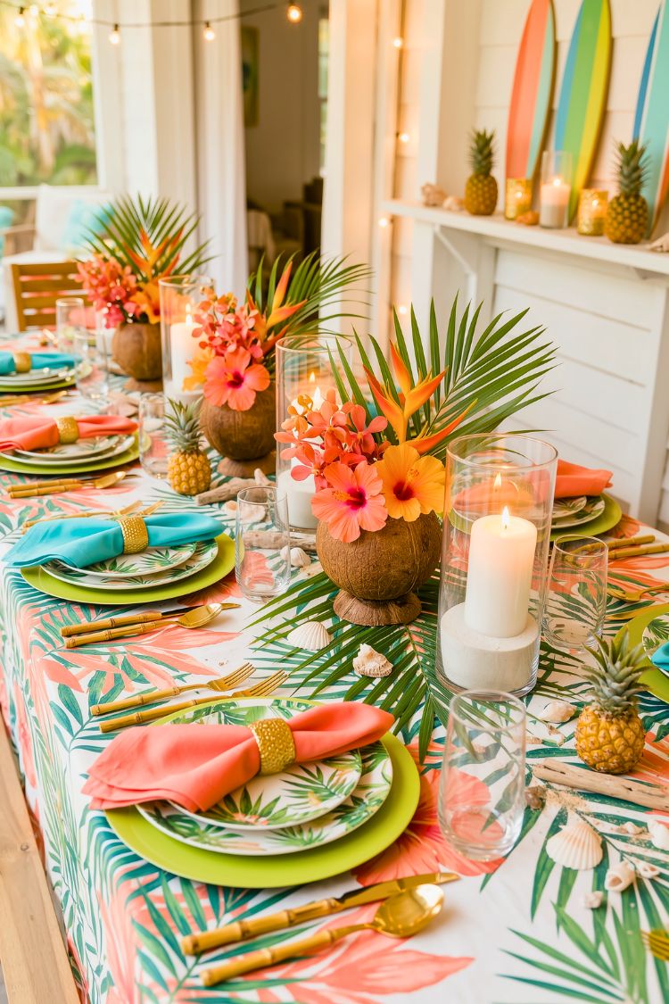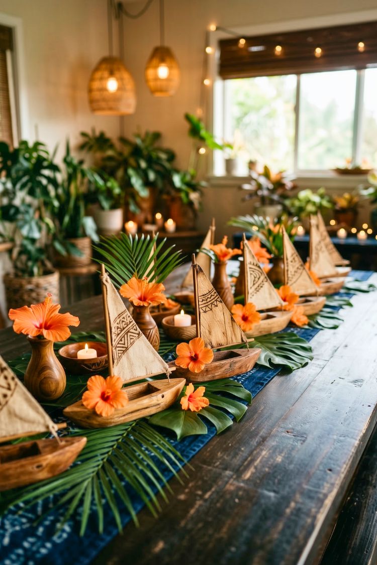 Little wooden sailboats running down the center of the table instantly make the setup feel playful and beachy. Each one sits among palm leaves, hibiscus flowers, and small candles, creating a tropical runner that feels creative without being overwhelming. The warm lighting and natural wood tones keep everything cozy, while the sailboats add a fun summer detail that guests would probably notice right away.
