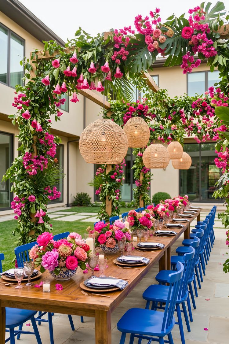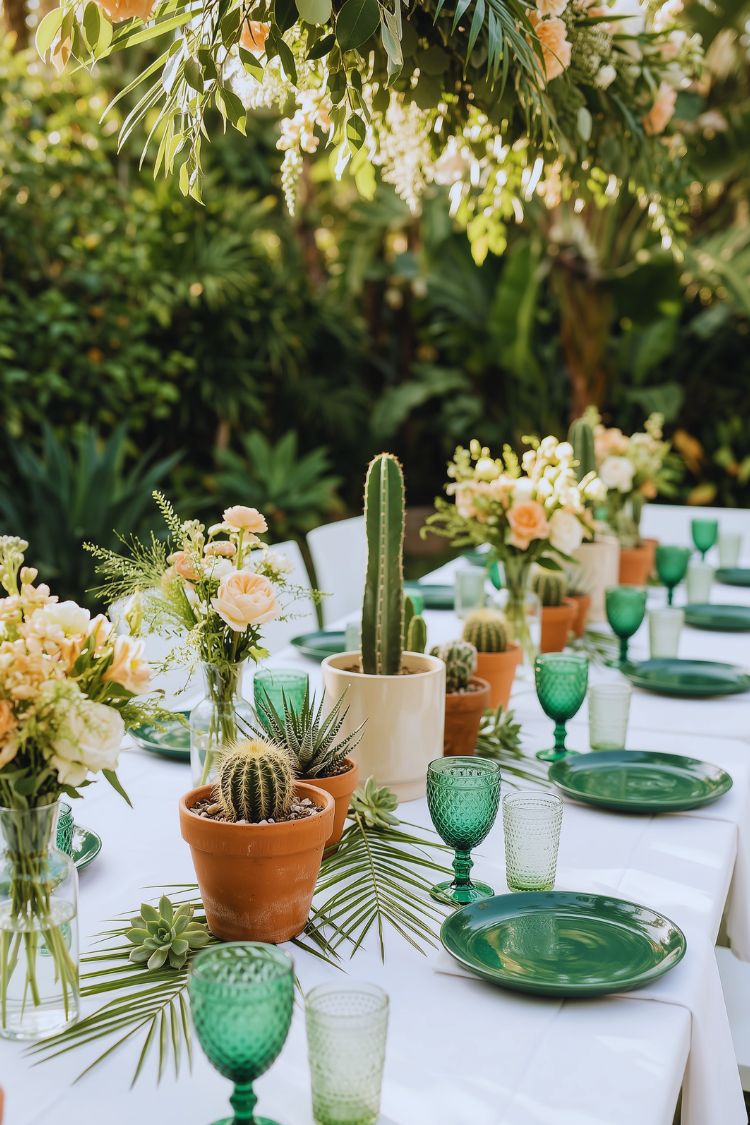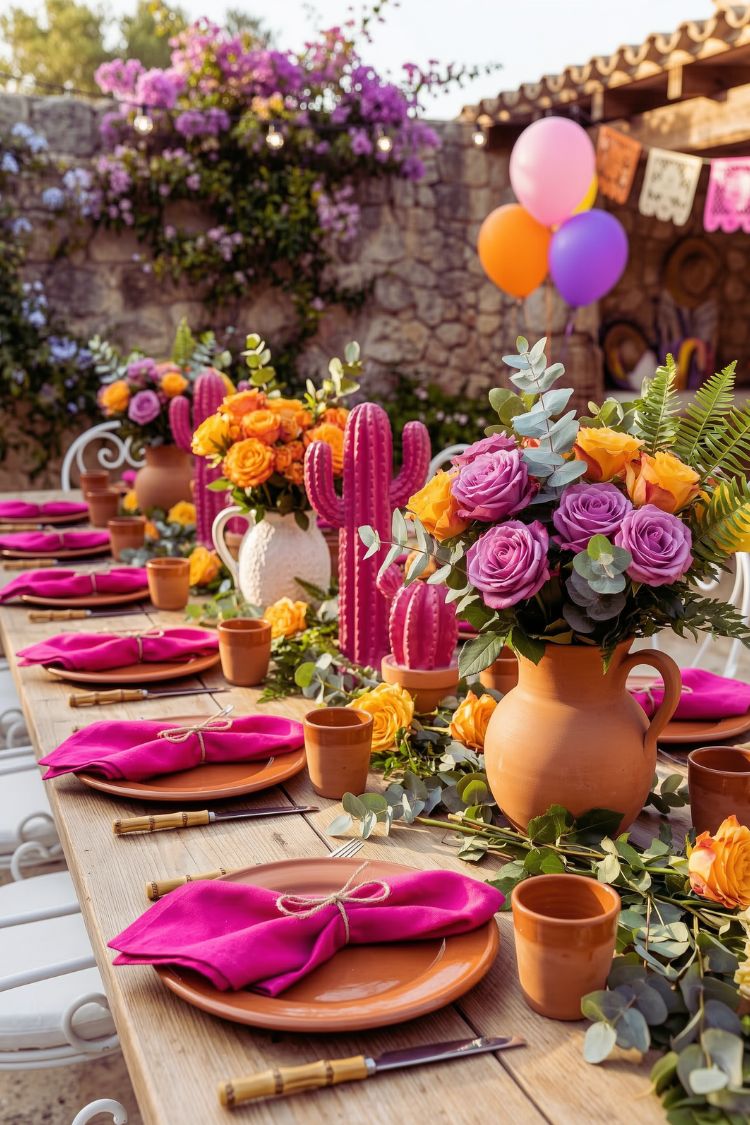 This one feels bold in the best way. The bright cactus centerpieces instantly grab attention, especially paired with those orange and purple flowers that make the whole table feel lively. I like how the terracotta pitchers keep everything grounded so the colors don’t feel overwhelming. It’s playful but still styled enough for a party.