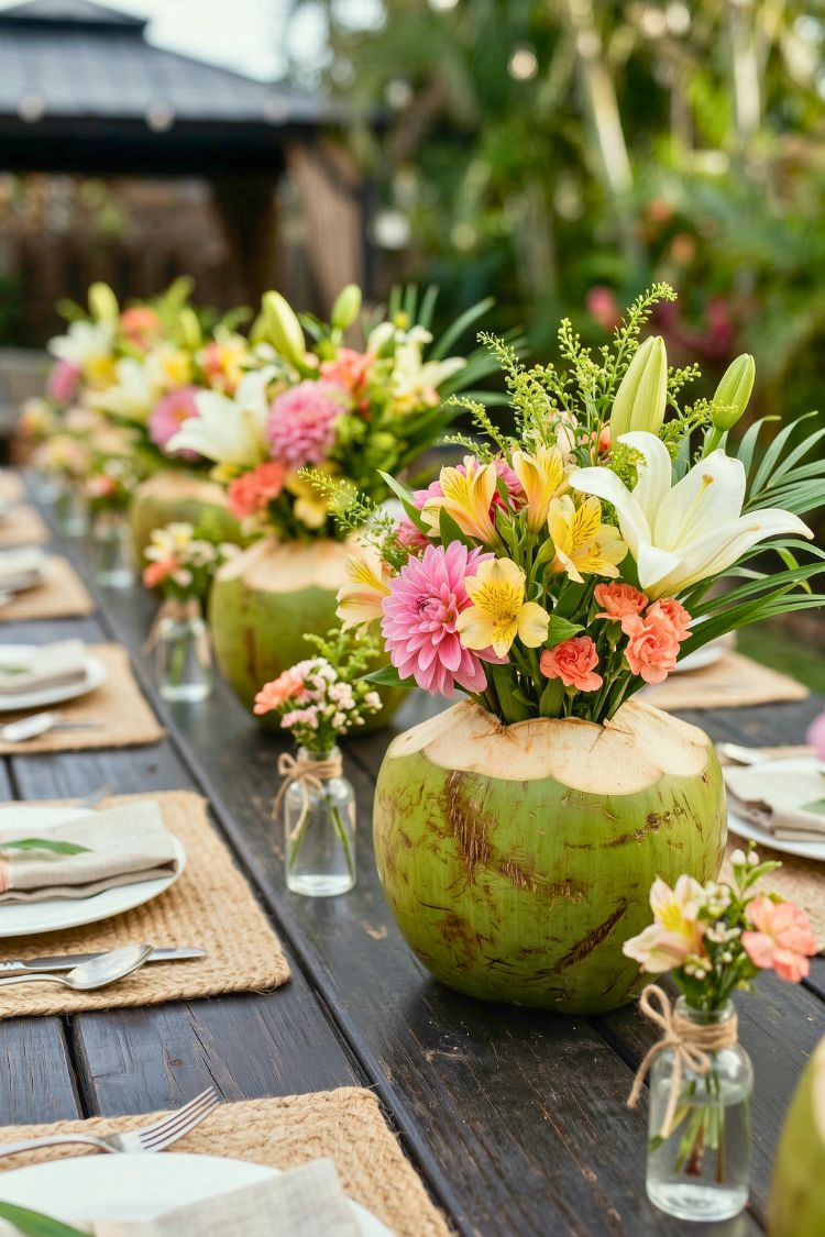The coconut centerpieces earlier were fun, but these carved green coconuts take it a step further. Seeing them used as actual flower vases instantly makes the table feel tropical without needing much else. The mix of lilies, dahlias, and small filler flowers keeps the arrangements colorful but still soft, and lining several of them down the table gives everything a relaxed rhythm instead of one big focal point. I also like the tiny glass bud vases tucked between them because they fill the gaps without cluttering the space. Honestly this feels like a setup I could imagine recreating for a backyard dinner.